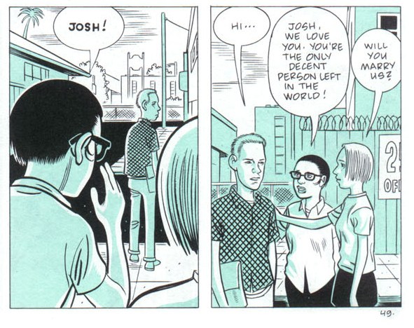 Istovremeno, Clowes ne preuzima od underground stripa seksploatatorski pristup ženama kakav je, na primjer, njegovao Robert Crumb. Da je Clowes kojim slučajem dijelio Crumbov senzibilitet, Ghost World (1997) ne bi bio moguć. Enid i Rebecca bi u tom slučaju bile topovsko meso muškog seksualnog sazrijevanja: njihova bi priča bila sporedna i uklopljena u tuđu. Umjesto toga, Clowes dvije prijateljice iz Svijeta duhova gradi na sličan način na koji gradi svoje neprilagođene muške protagoniste: kao zbunjene likove čija se svakodnevnica vrti oko kompliciranih, često karikaturalnih međuljudskih odnosa te neprestanih seksualnih trzavica. S tom razlikom da njih dvije nisu u potrazi za idealnim muškarcem jer su puno više usmjerene jedna na drugu, odnosno, na same sebe.