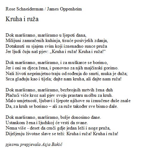 Htjela bih se zahvaliti i Maji Solar koja je prijevod pjesme tražila i kad ga nije mogla naći na internetu, sugerirala meni da Bread and Roses prevedem. Prepjev je namjerno uploadan kao slika da ga možete lakše dijeliti po blogovima, socijalnim mrežama, držati u novčaniku i ako treba, da vam pjesmu bude lakše tetovirati na grudi!